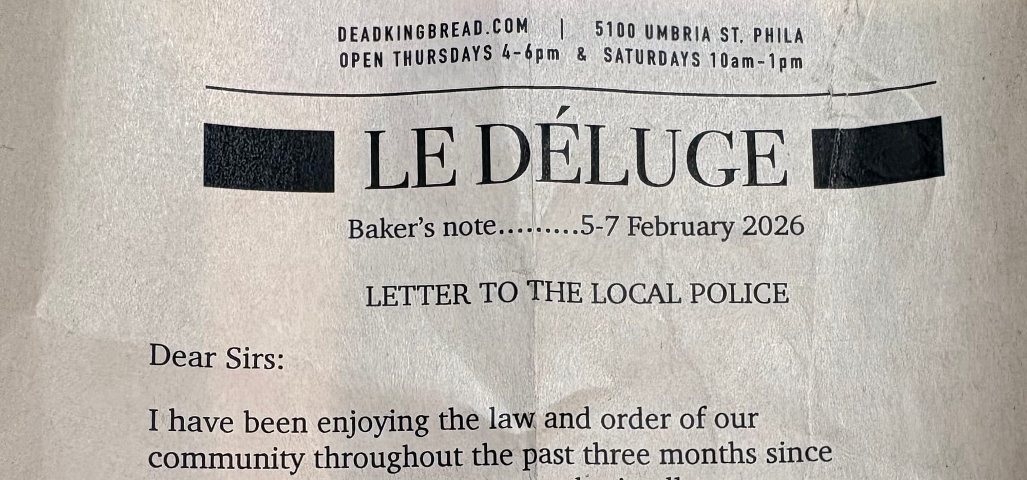 The bakery has two information channels. An email on Wednesdays has the upcoming week's menu. There is a small newsletter, printed on just one side of a 4×6 piece of newsprint, included in each bag of bread. My daughter reads both religiously. She would forward the emails each week, like she was my grandmother, until I signed up on my own. During the winter, as starvation and genocide in Gaza continued, those newsletters got darker. There were no more updates from the suggestion box. It was poems. Sad poems. The weekly emails announced fundraisers for Gaza. Our bakers seemed to feel a responsibility to connect us to the larger world even through their small informational enterprise. I started to see these emails as more than just menus.